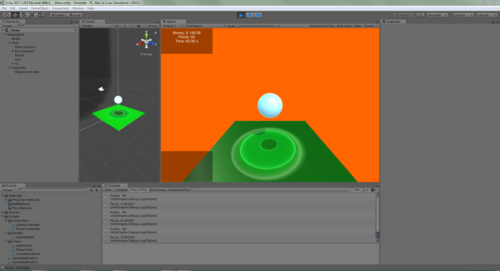 Prosta gierka w Unity 3D. Stosując wzorzec projektowy MVC tworzę gierkę na silniku Unity 3D, aby wdrożyć się znowu w ten silnik po pewnym czasie przerwy od moich starych projektów typu Vision The Game. Gra jest banalna. Polega na odbijaniu piłką od podłoża. Przy użyciu spacji możemy nią podskakiwać wyżej. Podczas kolizji piłki z podłożem zarabiamy pieniądze zależne od siły uderzenia piłki. Za zarobione pieniądze będzimy mogli kupować ulepszenia, które pozwolą nam dłużej się odbijać, więcej zarabiać, a nawet dokładać kolejne piłki :)